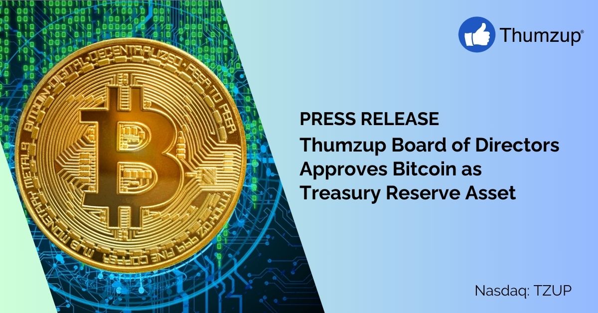 ("Thumzup" or the "Company") (Nasdaq: TZUP), a leading provider of innovative social media branding and marketing solutions that allow businesses and brands to pay customers and fans cash through Venmo and PayPal for their posts on social media, announced today that the Company’s Board of Directors approved the purchase of up to $1 million in Bitcoin.